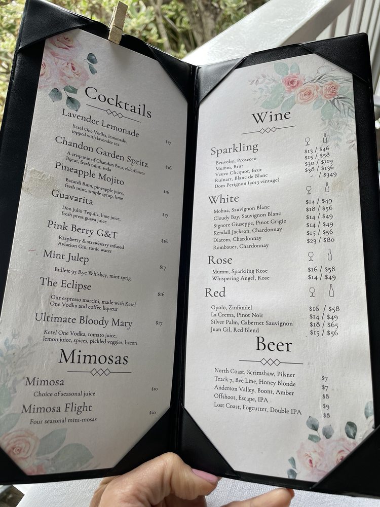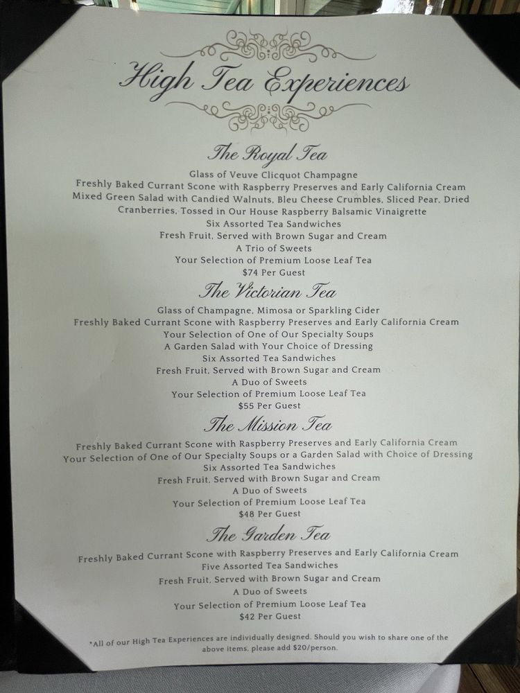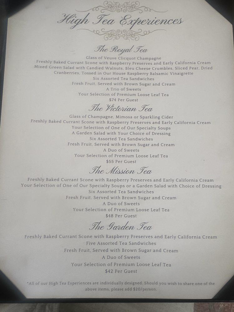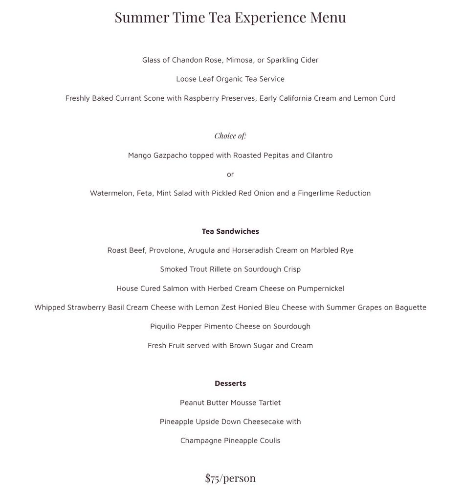 Glass of Champagne, Mimosa or Sparkling Cider Freshly Baked Currant Scone with Raspberry Preserves and Early California Cream Your Selection of One of Our Specialty Soups A Garden Salad with Your Choice of Dressing Six Assorted Tea Sandwiches Fresh Fruit, Served with Brown Sugar and Cream A Duo of Sweets Your Selection of Premium Loose Leaf Tea