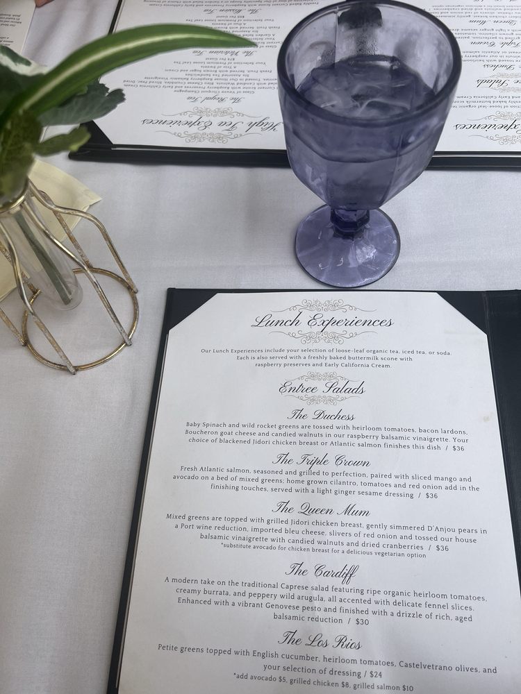 Glass of Veuve Clicquot Champagne Freshly Baked Currant Scone with Raspberry Preserves and Early California Cream Mixed Green Salad with Candied Walnuts, Bleu Cheese Crumbles, Sliced Pear, Dried Cranberries, Tossed in Our House Raspberry Balsamic Vinaigrette Six Assorted Tea Sandwiches Fresh Fruit, Served with Brown Sugar and Cream A Trio of Sweets Your Selection of Premium Loose Leaf Tea
