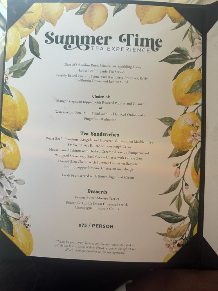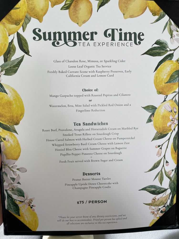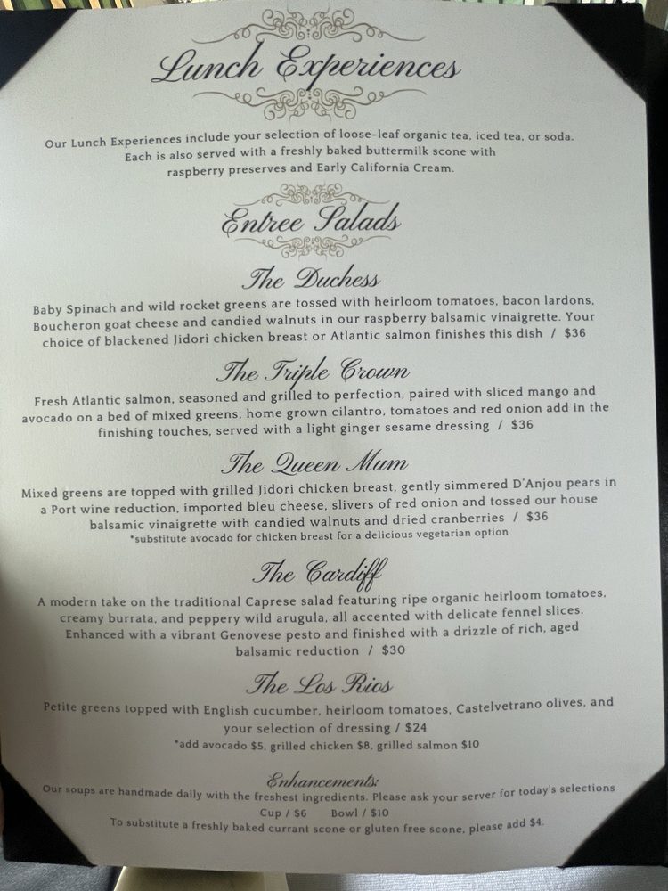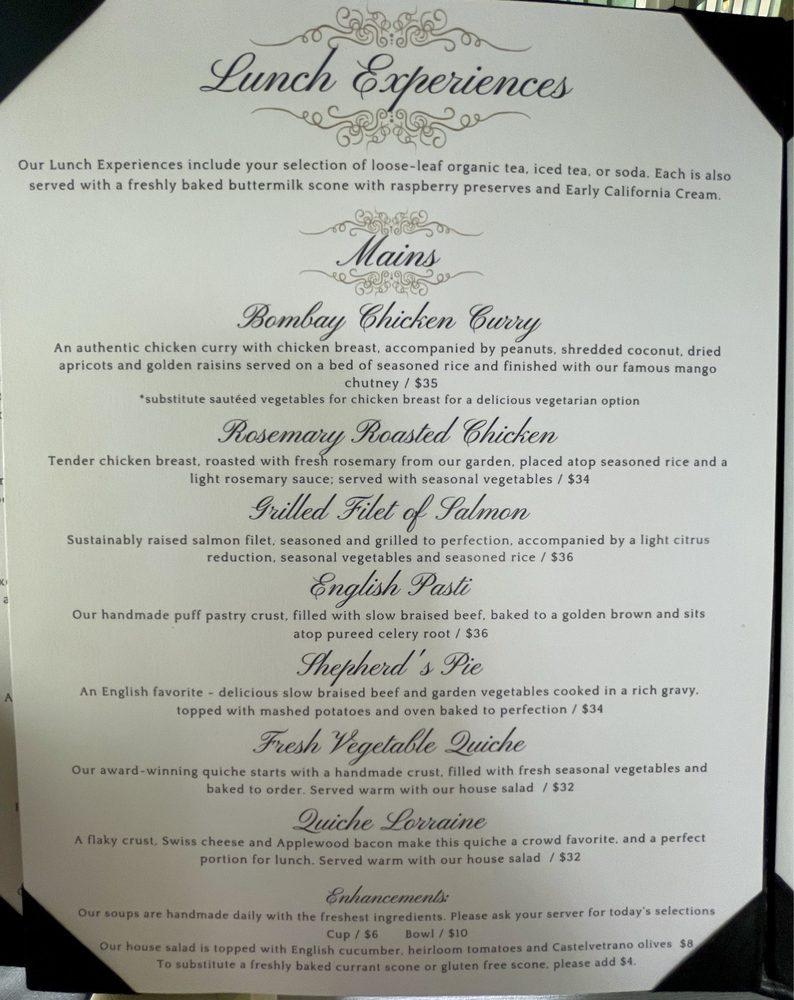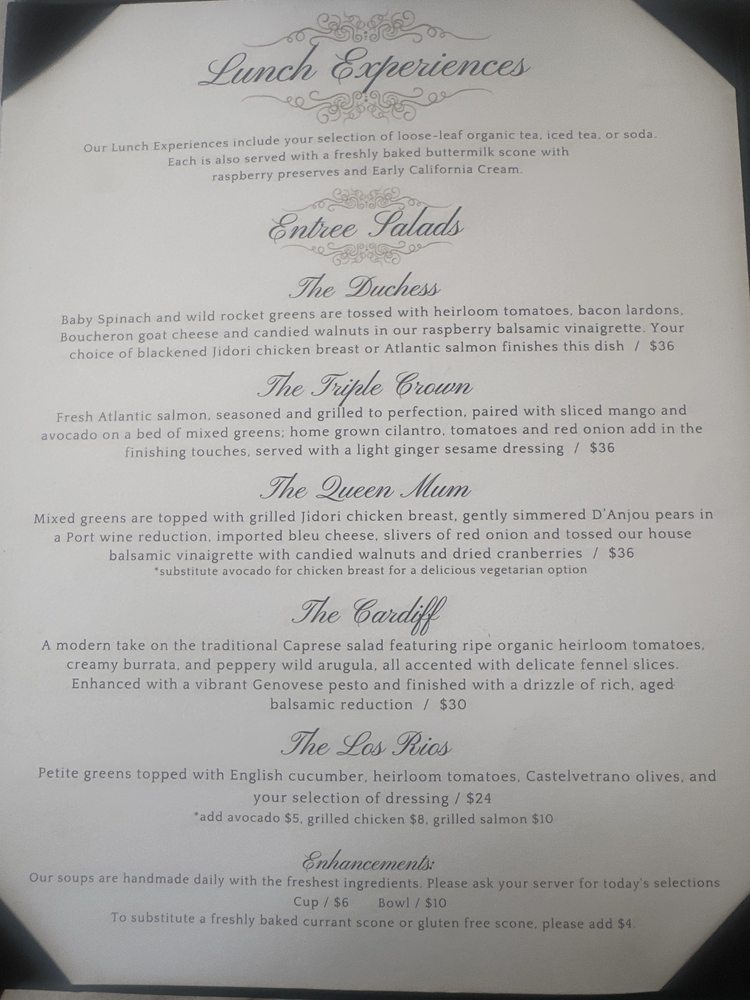 Freshly Baked Currant Scone with Raspberry Preserves and Early California Cream Your Selection of One of our Specialty Soups or a Garden Salad with Choice of Dressing Six Assorted Tea Sandwiches Fresh Fruit Served with Brown Sugar and Cream A Duo of Sweets Your Selection of Premium Loose Leaf Tea