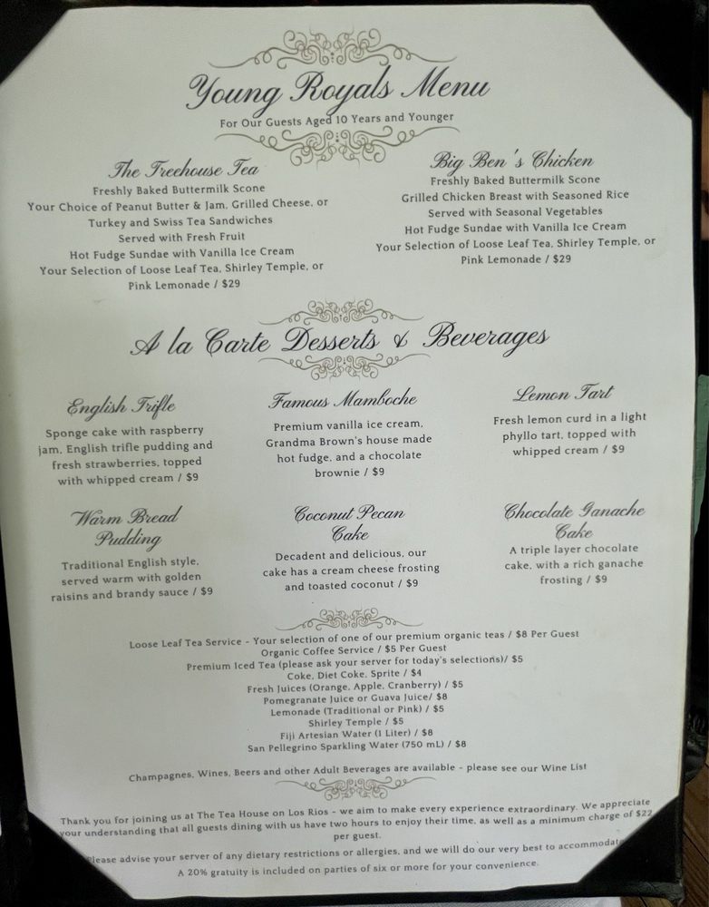 Welcome to the enchanting Tea House on Los Rios, where every detail is thoughtfully crafted to create a memorable dining experience in San Juan Capistrano. This cozy venue offers a range of unique tea options and delectable food choices, perfect for breakfast, brunch, or a special event like a bridal shower. The Victorian tea menu stands out with its champagne or mimosa, soup, salad, sandwich platters, and decadent desserts. The ambiance is romantic, intimate, and classy, with outdoor seating available. Notable amenities include waiter service, vegan options, and reusable tableware. The Tea House on Los Rios truly knows how to please its guests, ensuring a delightful visit with delicious food and exceptional service. Reservations are recommended to secure your spot in this popular and charming tea house.